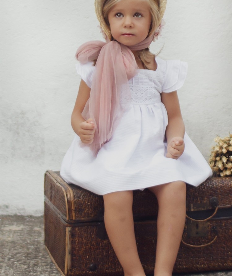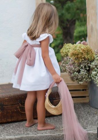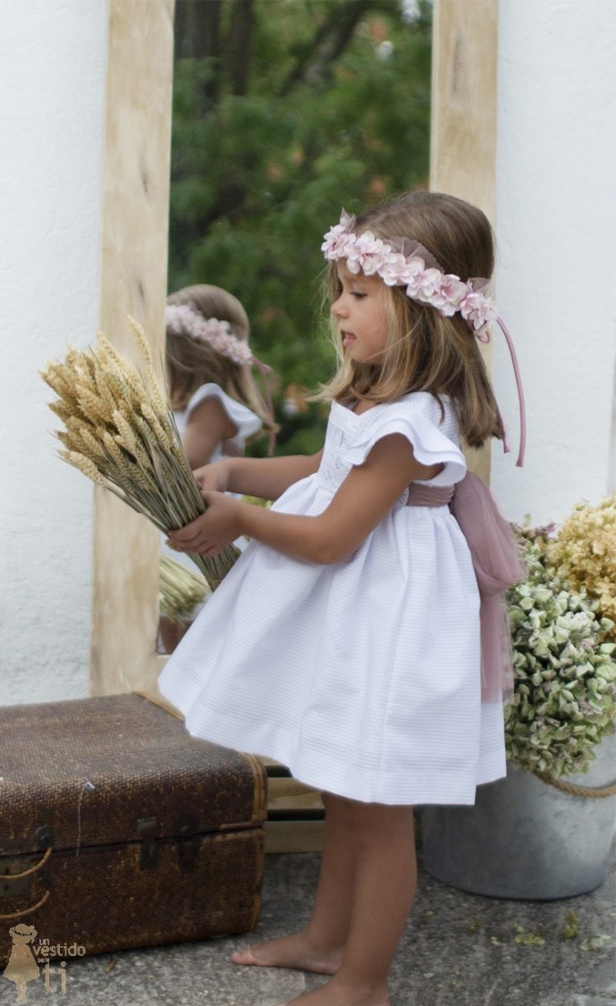 Vestido de arras y ceremonia en piqué rayado y fajín rosa empolvado. Viene con un precioso encaje de bolillos