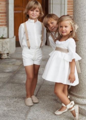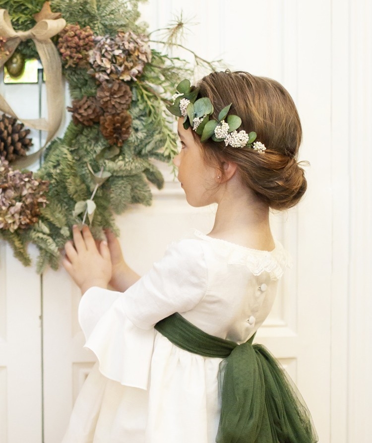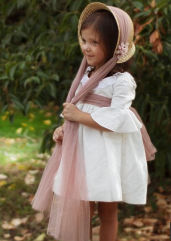 Vestido de arras y ceremonia en lino crudo. Manga tres cuartos con volante a la capa. Incluye lazada en tul del color de tu preferencia.